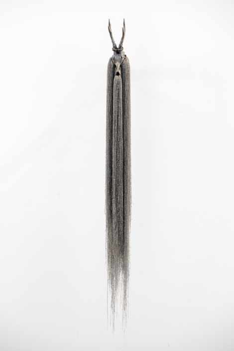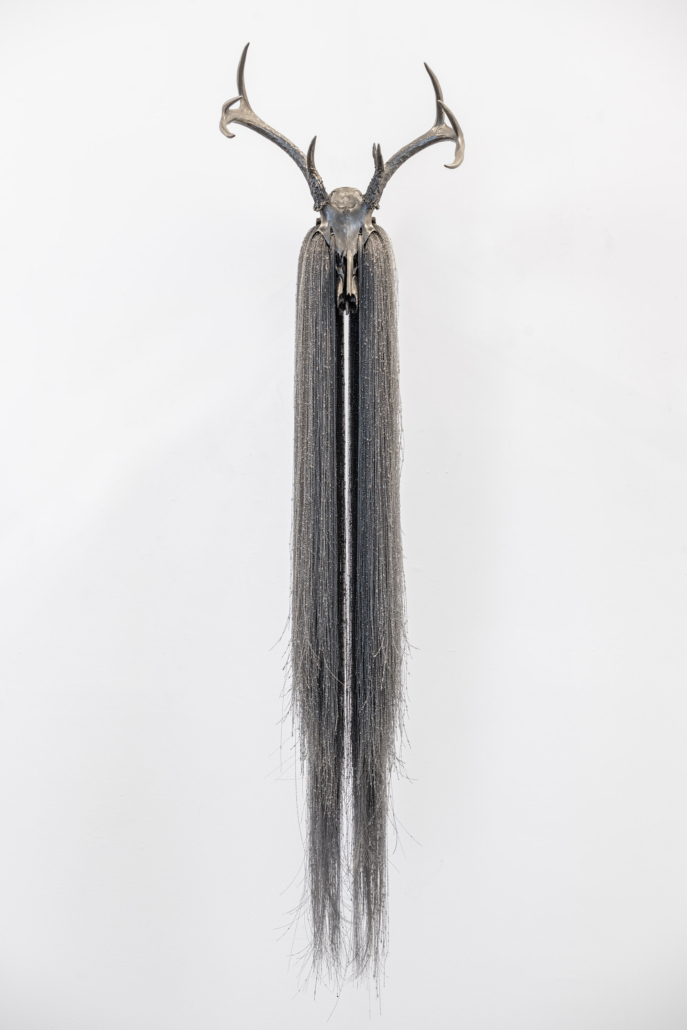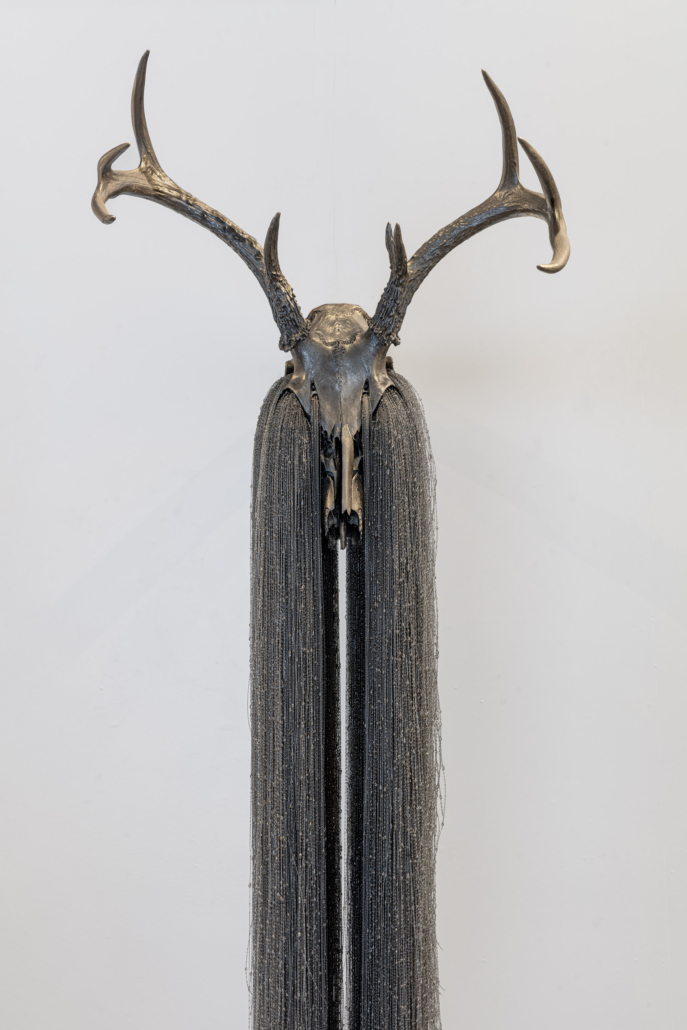Deer skull, graphite powder, wax, resin, monofilament, metal
