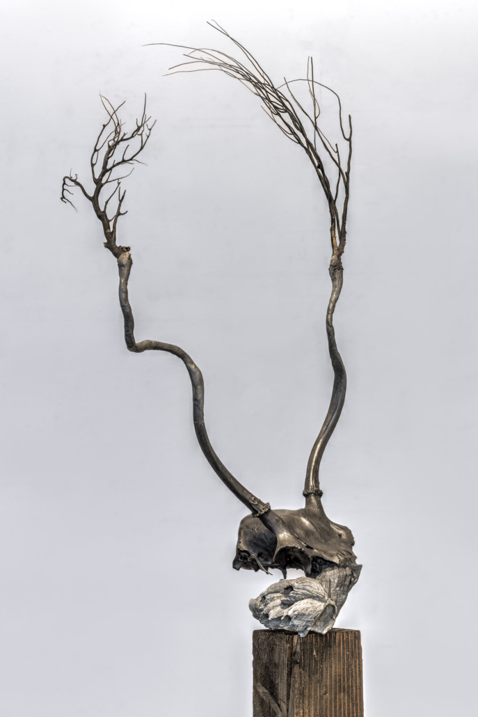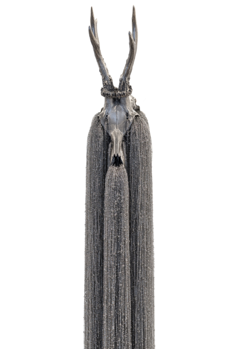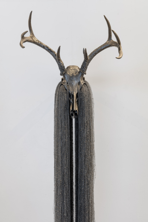 Stag skull, graphite powder, wax, resin, monofilament, metal