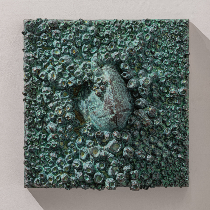 found bird’s nests, graphite powder, acrylic gel medium, black hot melt glue