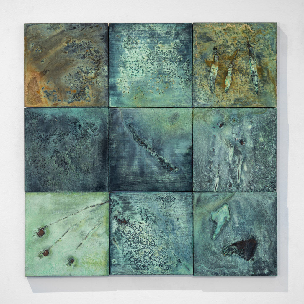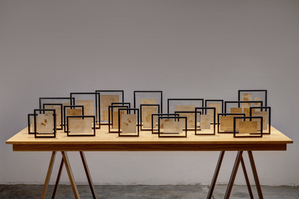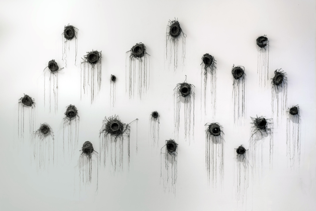 Twenty-two found bird’s nests, graphite powder, acrylic gel medium, black hot melt glue