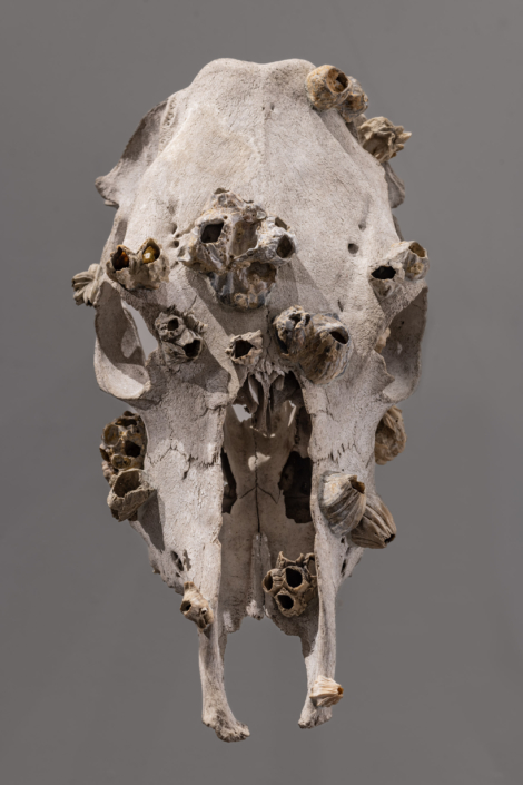 Deer skull cap, fossilized barnacles, coral sea whip, graphite powder, epoxy resin