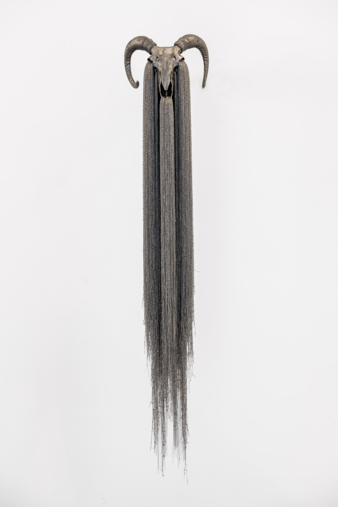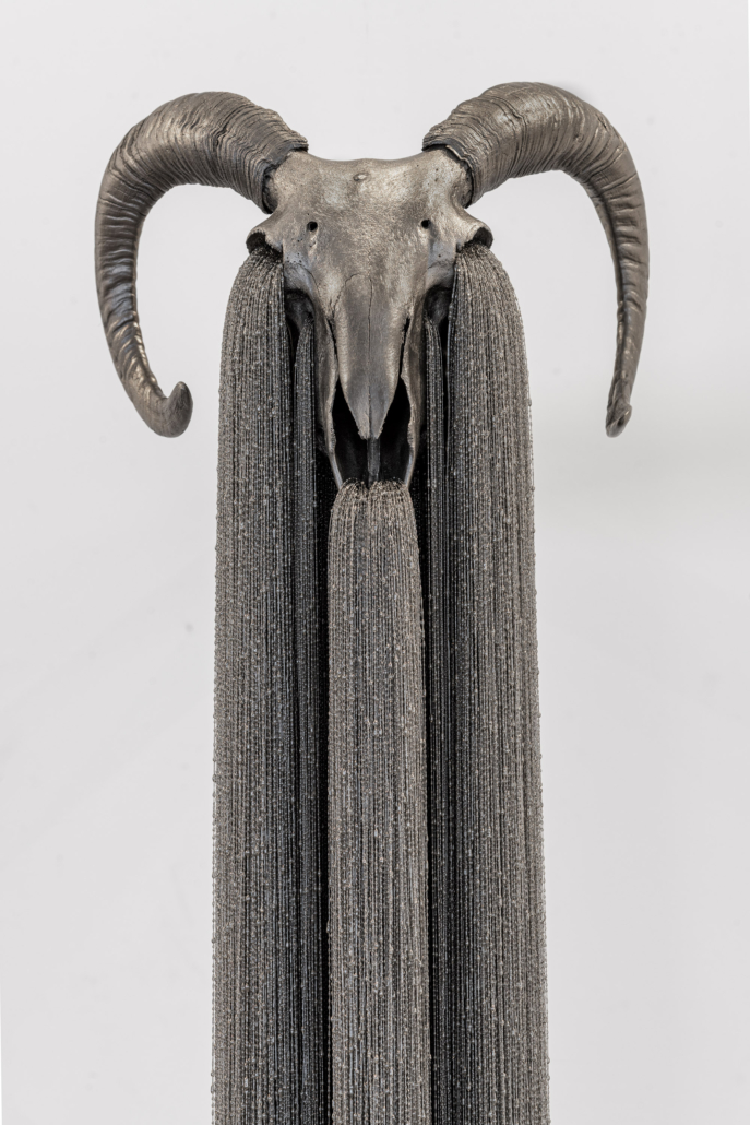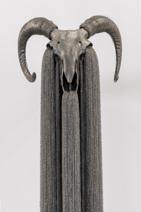 Bighorn sheep skull, graphite powder, wax, resin, monofilament