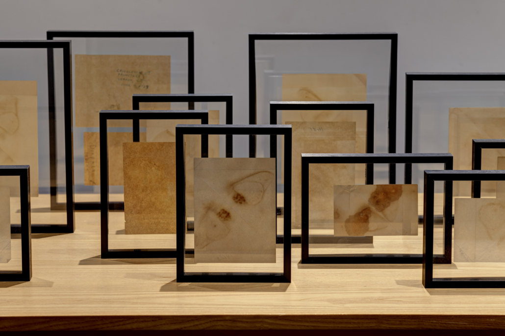 Vintage moth specimen envelopes, 24 glass frames, custom built wood table